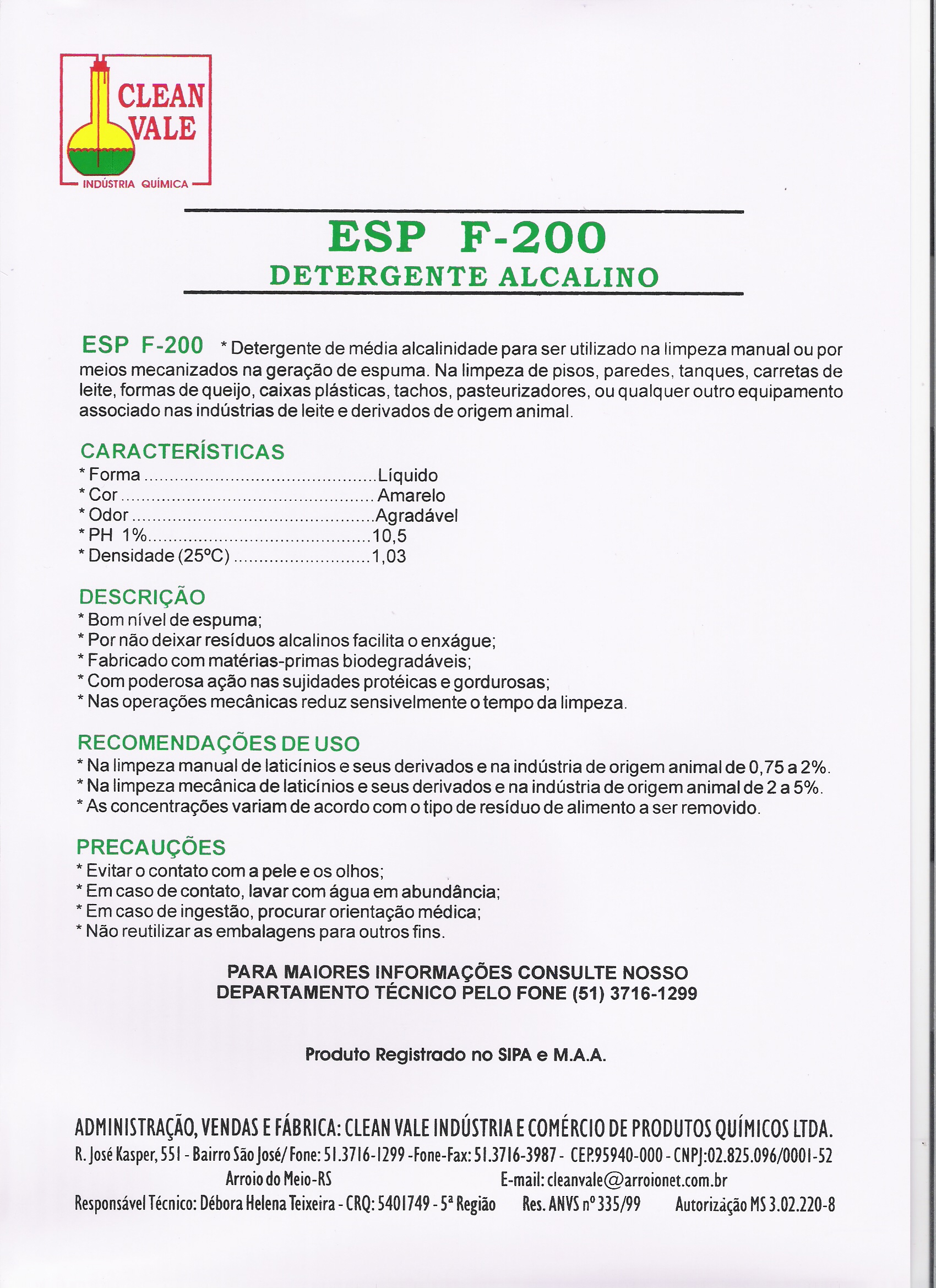 ESP F-200 Detergente de média alcalinidade para ser utilizado na limpeza manual ou por meios mecanizados na geração de espuma. Na limpeza de pisos, paredes, tanques, carretas de leite, forma de queijo, caixas plásticas, tachos, pasteurizadores, ou qualquer outro equipamento associado nas indústrias de leite e derivados de origem aninal.