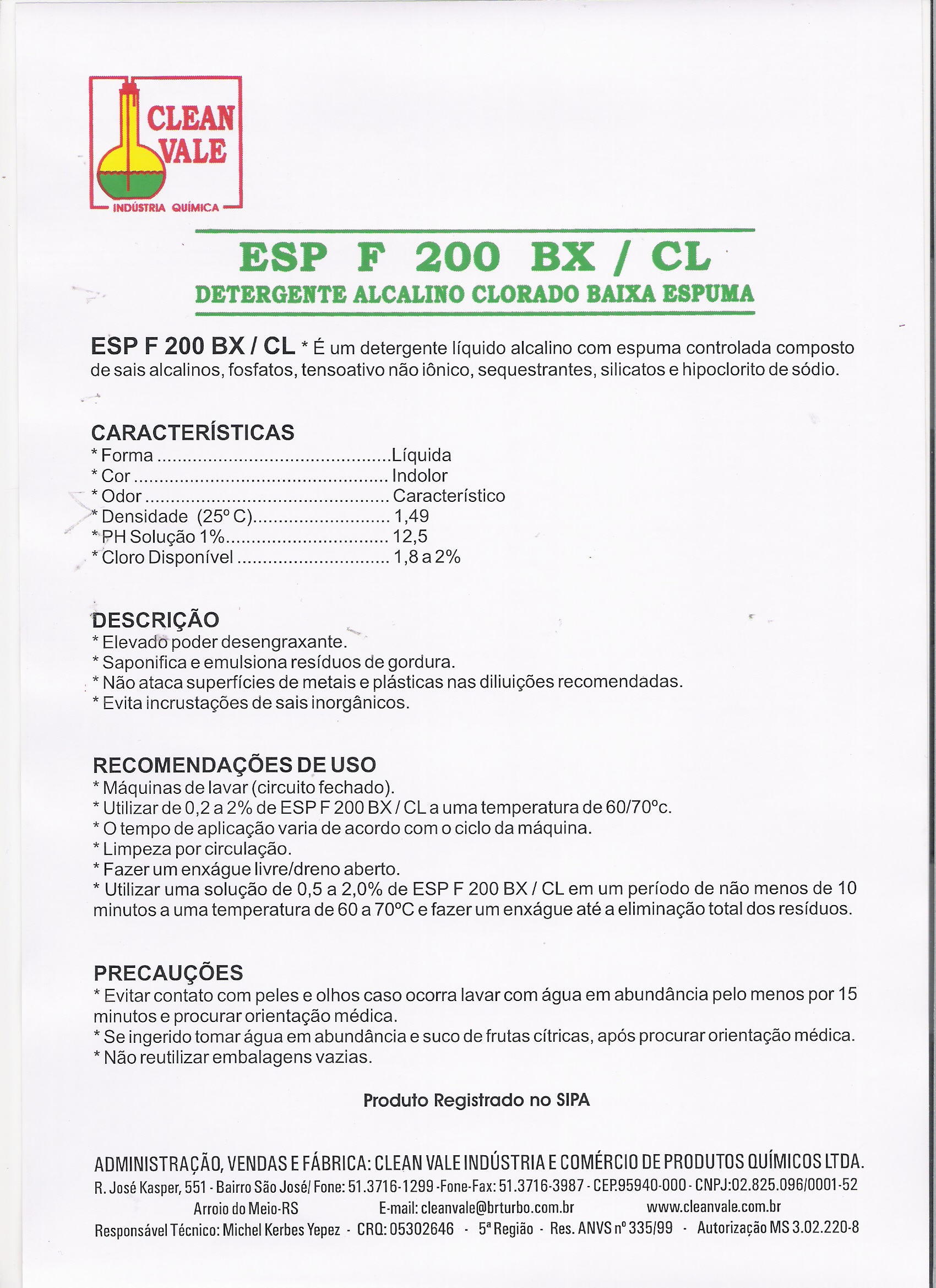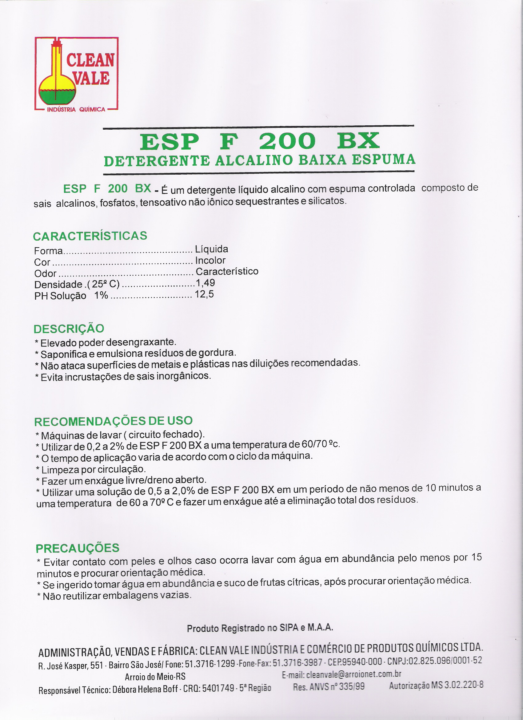 ESP F 200 BX – É um detergente líquido alcalino com espuma controlada composto de sais alcalinos, fosfatos, tensoativo não iônico sequestrantes e silicatos.