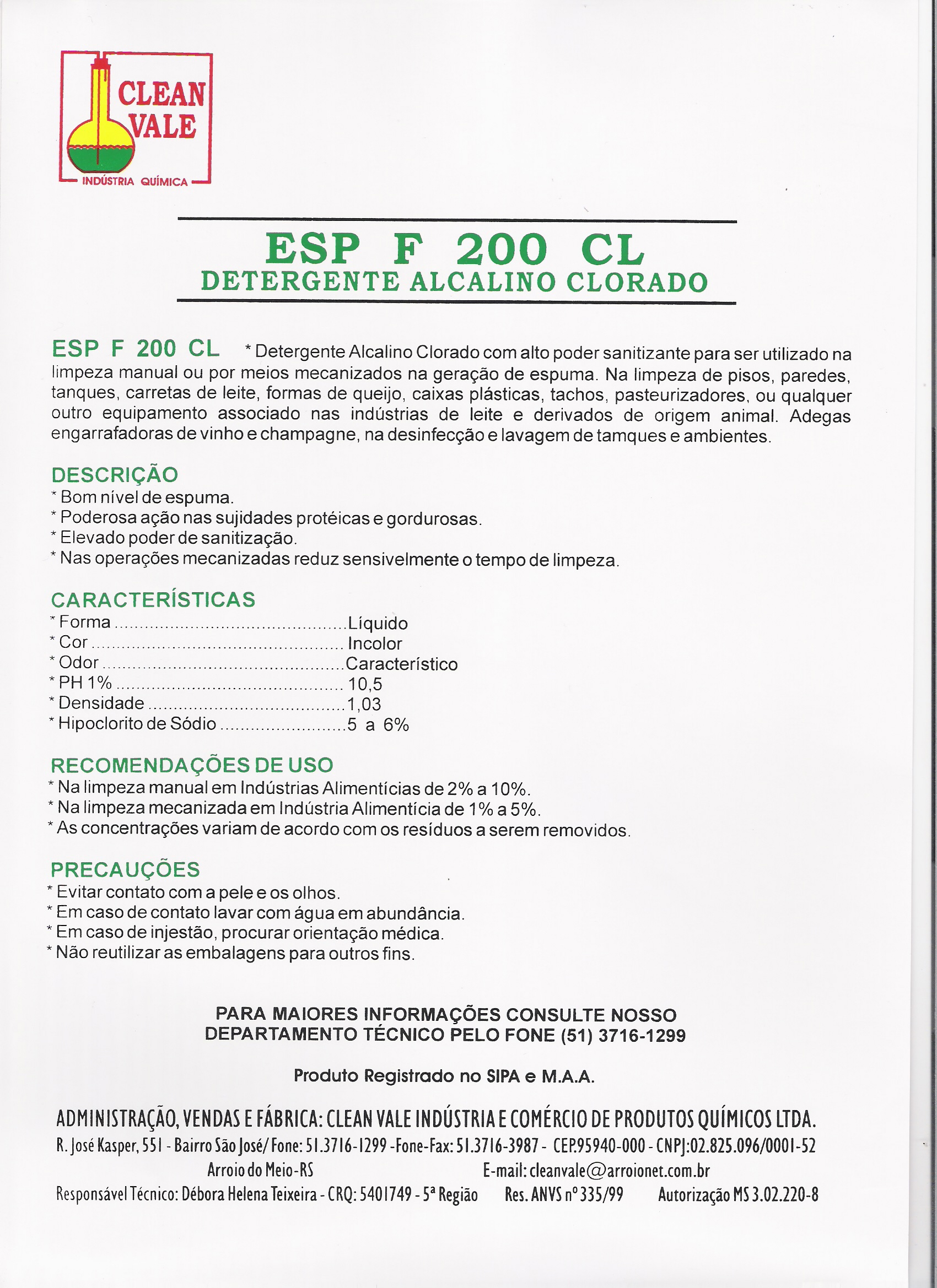 ESP F 200 CL – Detergente Alcalino Clorado com alto poder sanitizante para ser utilizado na limpeza manual ou por meios mecanizados na geração de espuma. Na limpeza de pisos, paredes, tanques, carretas de leite, formas de queijo, caixas plásticas, tachos, pasteurizadores, ou qualquer outro equipamento associado nas indústrias de leite e derivados de origem animal. Adegas engarrafadoras de vinho e champagne, na desinfecção e lavagem de tangues e ambientes.